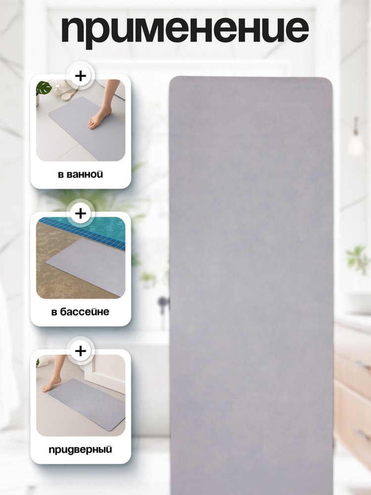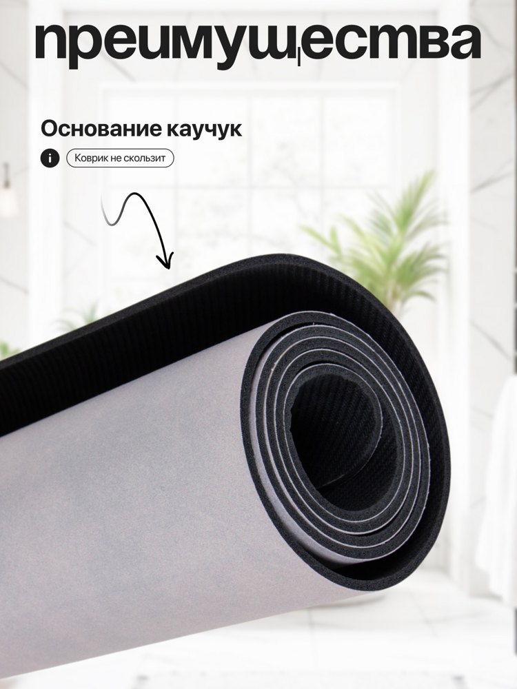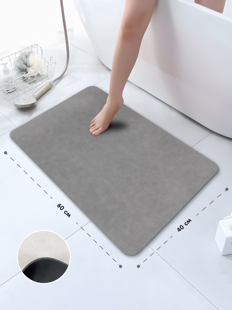 Коврик в ванную комнату, лицевая поверхность: полиэстер, основание - вспененный натуральный каучук, толщина 3мм. Плотность 1800 г/м2. Размер 40х60 см. Производство: Китай