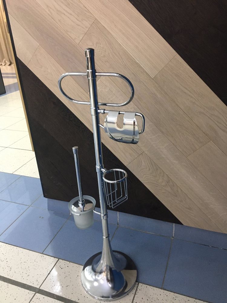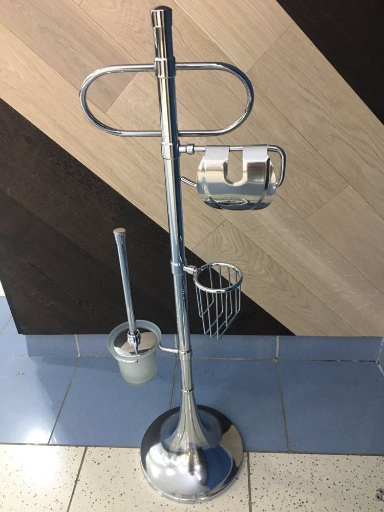 Стойка комбинированная для туалета. В комплекте - ершик туалетный в стеклянной матовой колбе, держатель туалетной бумаги с крышкой, держатель освежителя воздуха и держатель для полотенец (универсальный)