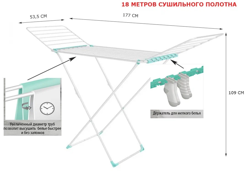Сушилка (сушка) напольная с толстыми прутьями. Цвет сушилки: белый. Рабочая поверхность 18 м. Размер в разложенном виде 1115х535х1770 мм, в сложенном 1285*535*50 мм. Вес 4,2 кг
