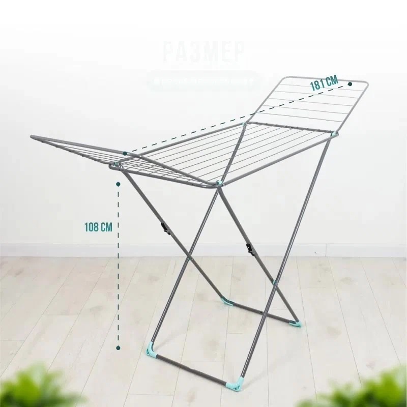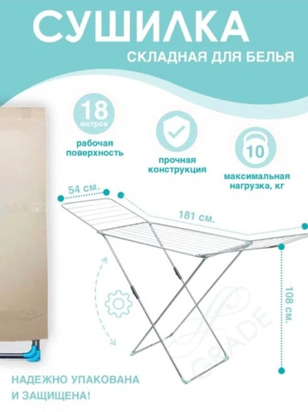 Сушилка (сушка) напольная. Цвет сушилки: серебристый. Рабочая поверхность 18 м. Размер в разложенном виде 181х53,5х108,0 см, в сложенном виде 130*53,5*3 см. Вес 3,30 кг