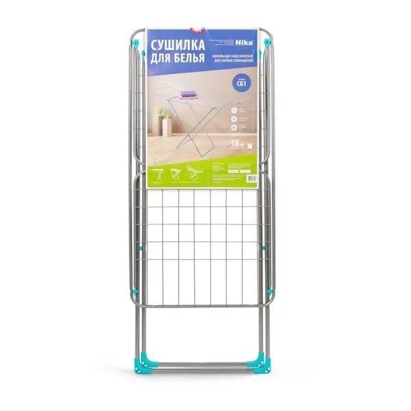 Сушилка (сушка) напольная. Цвет сушилки: серый. Рабочая поверхность 18 м. Размер в разложенном виде 181х53,5х108,0 см, в сложенном виде 130*53,5*3 см. Вес 3,30 кг. Производитель: Ника (Россия)
