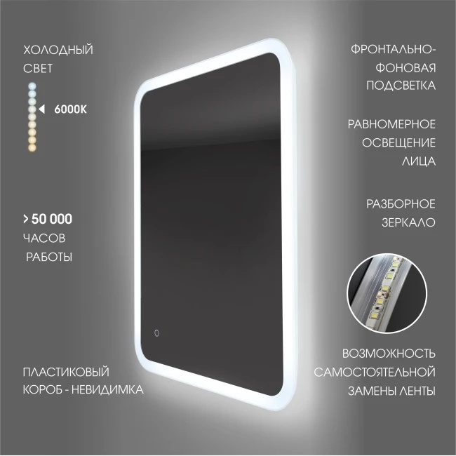Зеркало с фоново-фронтальной подсветкой, с сенсорной кнопкой Palmer 10070s-6 ( 100х70 см) в светопропускающем коробе- холодный свет. Тип лампы светодиодная (Led), управление подсветкой - сенсорная кнопка. Положение горизонтальное-вертикальное. Напряжение 220 - 240 V / 50Hz. Напряжение светодиодов 12 V, цветовая температура 6000 К. Срок службы 50 000 ч, цвет свечения холодный. Класс энергопотребления А++. Степень пылевлагозащиты IP 44. Размеры высота 700 мм, ширина 1000 мм, глубина 25 мм