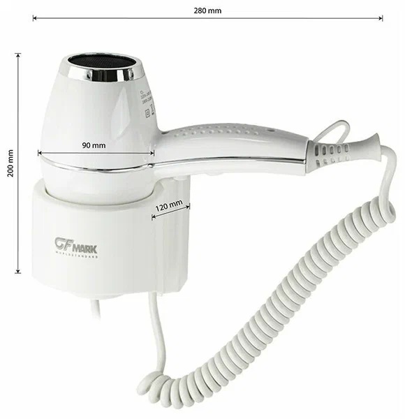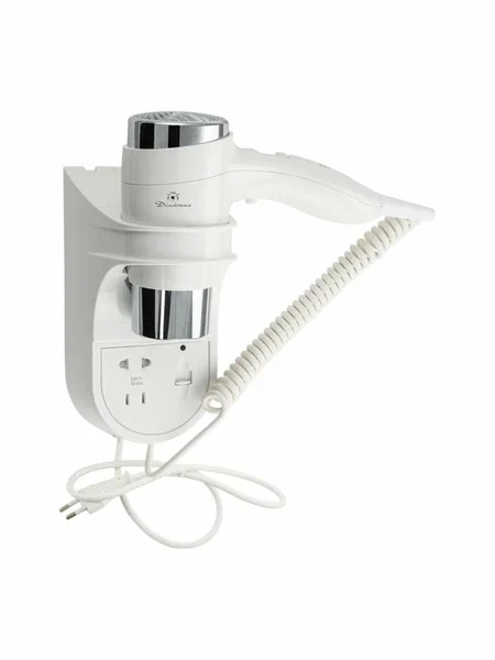 Фен для сушки волос для ванной, для отелей, Монтаж настенный с боковым креплением. Материал ABS-пластик с хромированными вставками. Мощный фен-1800 Вт с горячим и холодным потоком воздуха. Напряжение-230 В, 50 Гц. Цвет белый. Гарантия 6 месяцев.