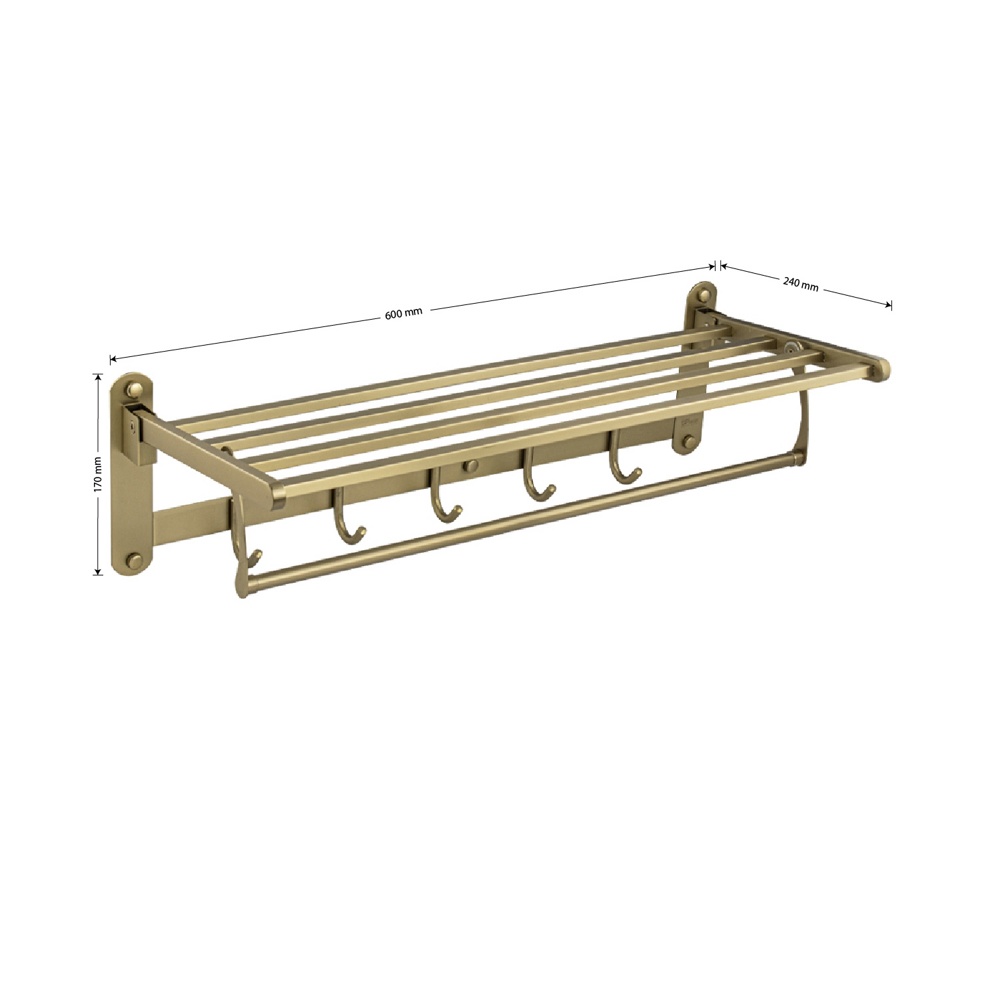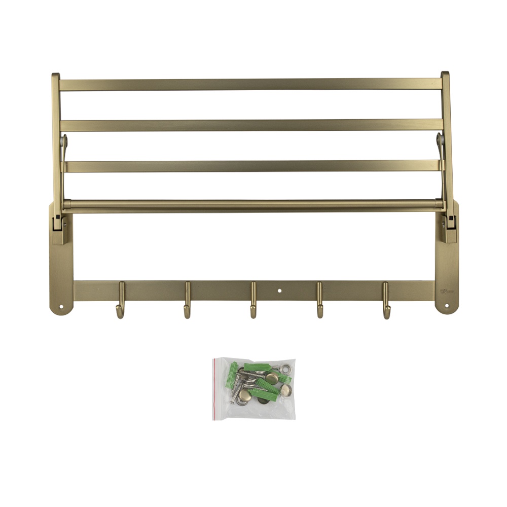 Полка для полотенца с опорой GFmark 1040 в цвете матове золото, для ванной, привлекает своим современным дизайном, многофункциональностью и надежностью конструкции. Откидывающаяся на 90° верхняя часть полки позволяет размещать её даже в самых тесных помещениях. Кухня, ванная, прихожая, кладовка или гардеробная - эта полка идеально подойдет везде. Металлическая полка оснащена дополнительной перекладиной и крючками. Безупречно отшлифованная нержавеющая сталь делает её устойчивой к влаге и исключает появление ржавчины. Полка для ванной - функциональное и практичное решение для любого интерьера. Материал изготовления — нержавеющая сталь 304. Изделие крепится к стене с помощью дюбелей и саморезов (входят в комплект).
