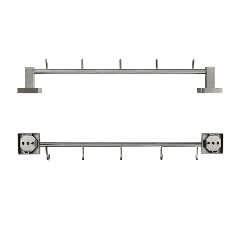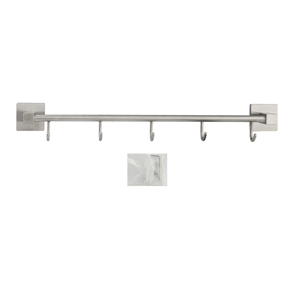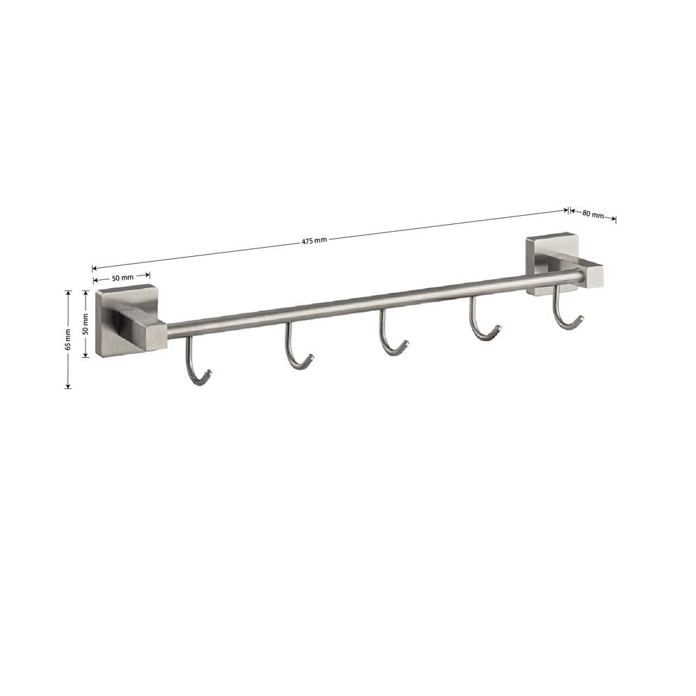 Держатель для полотенец металлический с пятью крючками. Изготовлен из прочной нержавеющей стали марки SUS 304 с матовым покрытием, которое придает безупречный стильный вид и долговечность. На держателе с легкостью можно размещать вещи для сушки или вешать, как полотенца, так и одежду перед походом в душ. Изделие крепится к стене с помощью дюбелей и саморезов (входят в комплект). Размеры: длина 475 мм, высота 65 мм, глубина 80 мм, посадочное седло 50*50 мм. Вес - 0,500 кг